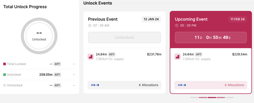 以下のスクリーンショットは、Aptosが2024年2月11日に2億2954万ドル相当の2484万APTトークンをアンロックすることを示しています。
