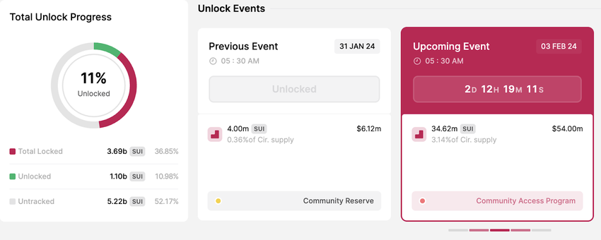 一方、Suiはコミュニティアクセスプログラムのために5400万ドル相当の3462万トークンをリリースします。Suiトークンのアンロックは2月3日に予定されている。
