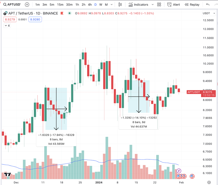 以前、同プロジェクトは2024年1月12日と2023年12月12日に同額をアンロックした。以前のアンロック中、下のスクリーンショットはAPTトークンの価格がそれぞれ17.94%と14.10%急落したことを示している。