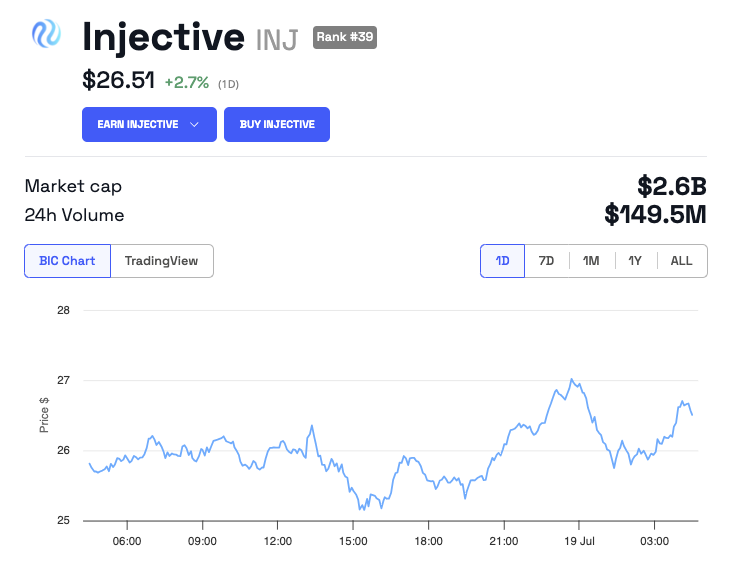 機関投資家の大きな関心を集める可能性があるにもかかわらず、市場の反応は鈍い。INJの価格は過去24時間でわずか2.7%上昇し、現在26.51ドルで取引されている。