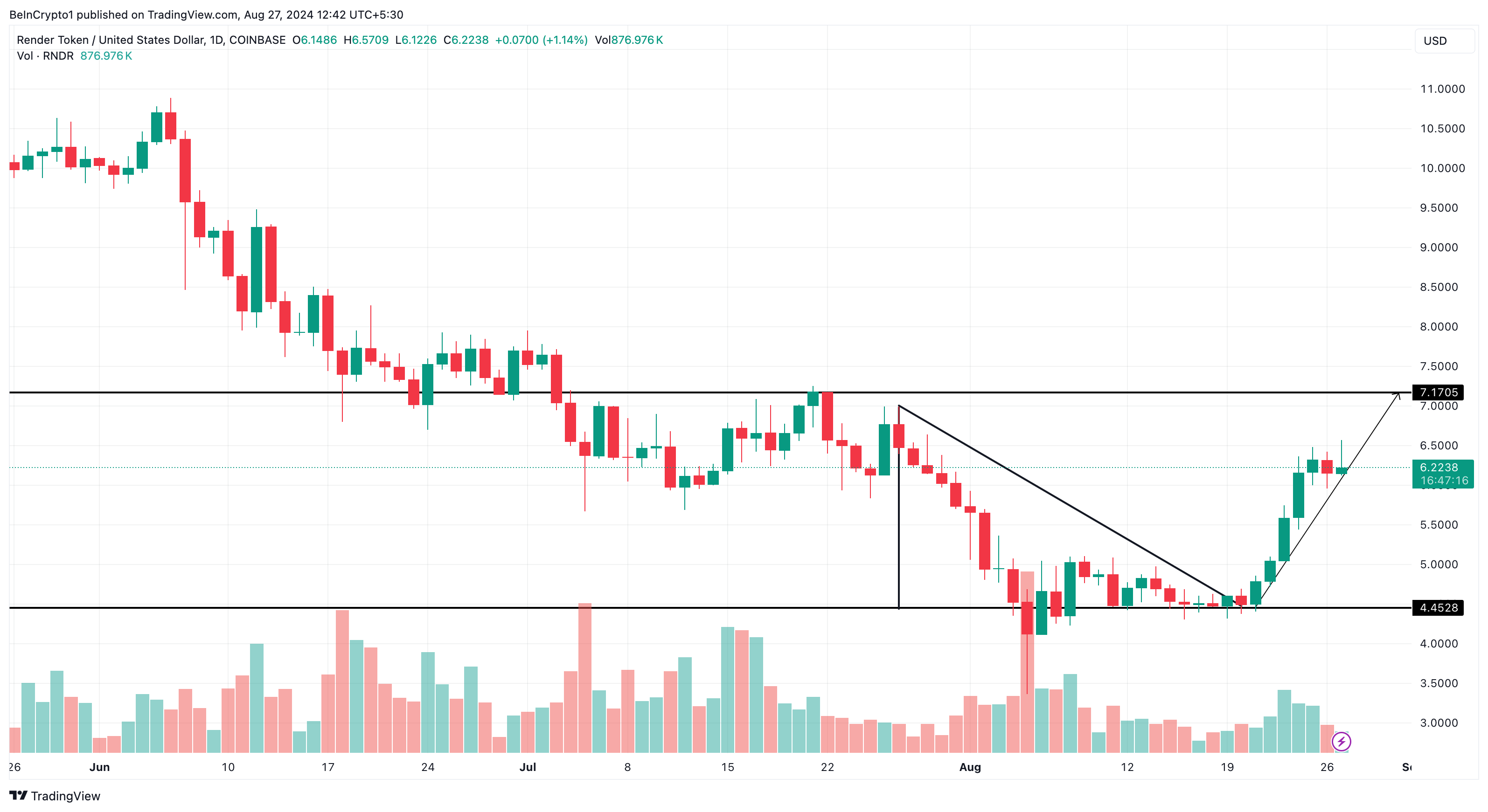 チャートによると、RNDRは4.45ドルで強力なサポートがあり、さらなる下落の可能性は低い。強気の勢いが持続すれば、RNDRの価格は短期的に7.17ドルに近づく可能性がある。