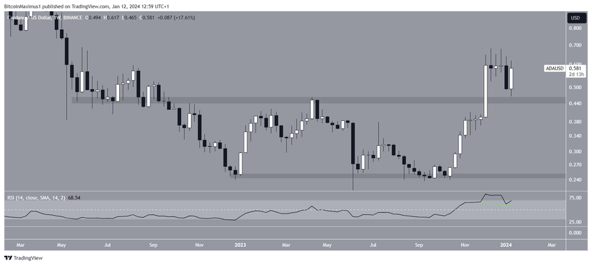 2023年10月、ADA価格は急速な上昇を開始し、翌月にはレンジをブレイクした。上昇の頂点は12月の高値0.68ドルで、年初来高値を更新した。