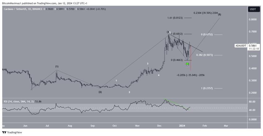 最も可能性の高い波動カウントは、ADA価格が5波上昇の第5波と最終波に入ったことを示している。第4波は1月8日の強い反発で終了し、価格は0.382フィブ・リトレースメントのレジスタンス・レベルを上回った。