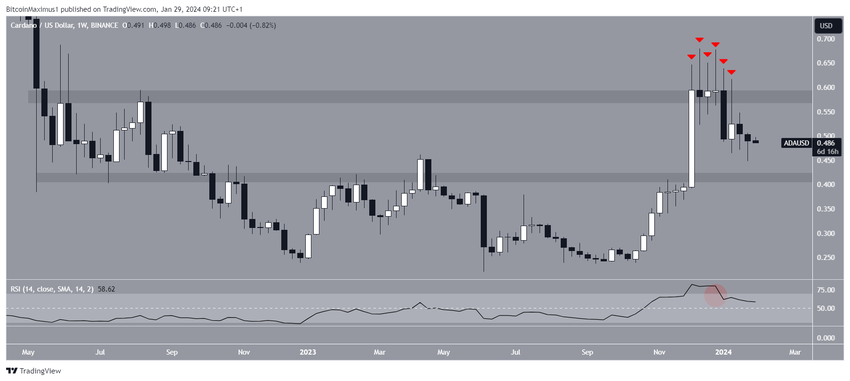 週足時間枠のテクニカル分析によると、ADA価格は2023年10月以降、急速に上昇している。しかし、何度もの試行にもかかわらず、2022年5月以来の重要な水平レジスタンスエリアからのブレイクアウトに失敗している。