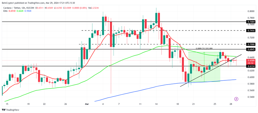 これにより、第3世代暗号通貨は0.68ドルのレジスタンス・レベルを上回ることになる。これがサポートに転じれば、ADAは0.70ドルを超え、カルダノは0.74ドルに向けて上昇し、14%の上昇を記録することになる。