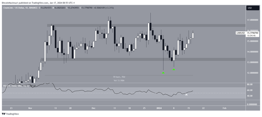 日足で見ると、LINKは1月3日に安値12.24ドルまで下落して以来、上昇している。1月8日に安値更新し、強気のローソク足を形成。その後、加速度的に上昇している。