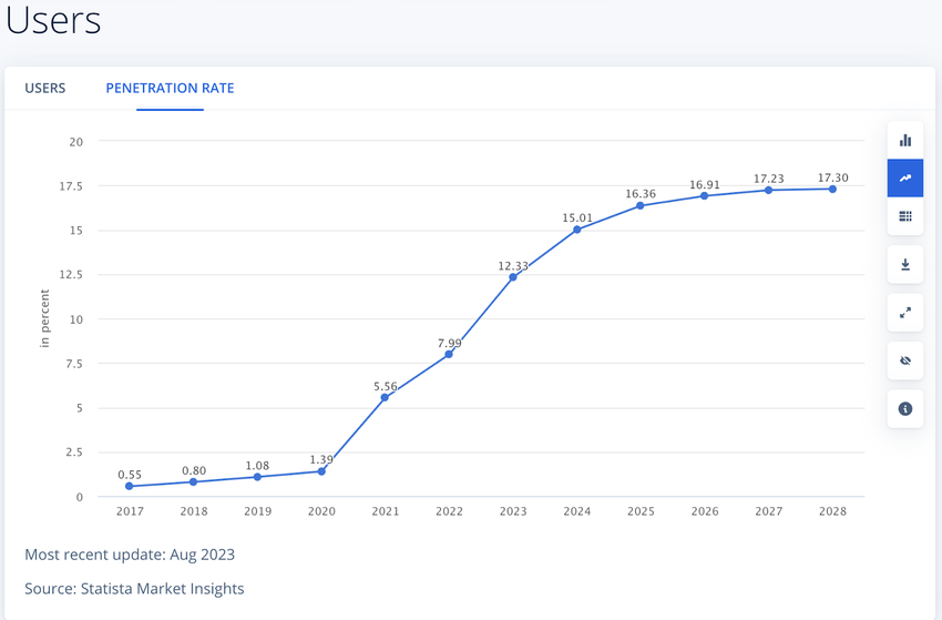 下のスクリーンショットは、トルコにおける暗号の普及率が2020年に急速に増加したことを示している。2023年、暗号ユーザーの普及率は12.33%に達し、2028年には17.30%まで増加すると予測されている。