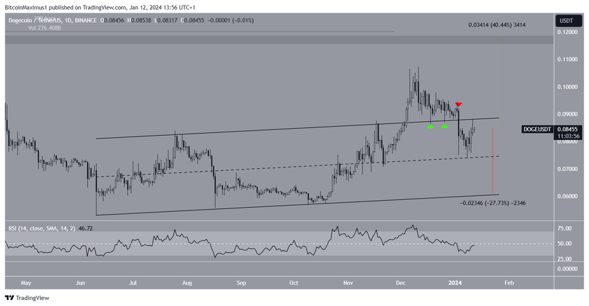 現在、DOGE価格はチャネルの抵抗トレンドライン(赤のアイコン)のすぐ下で取引されている。