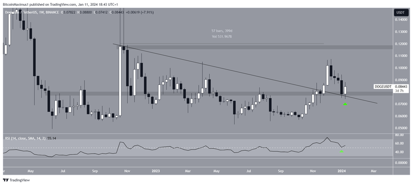 週足のテクニカル分析によると、DOGE価格は2023年10月以降、急速に上昇しています。価格は11月に下降トレンドラインからブレイクアウトした。当時、このトレンドラインは400日間維持されていた。