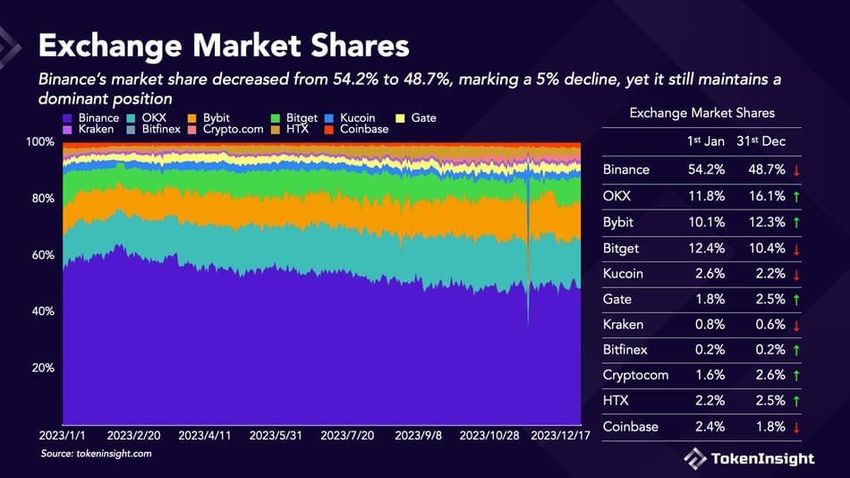 こうした法的トラブルにより、バイナンスの市場シェアは2023年初頭の54.2%から48.7%に低下している。