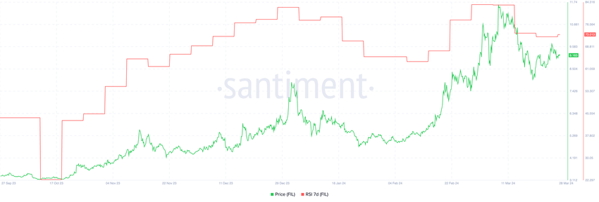 ファイルコインの最近のRSI 7Dは73で、3週間前の83の高値から顕著な下落を経験している。この変化はFILの市場動向の中で特に重要であり、活発な取引が続いた後の整理局面を示唆している。当初、FILはRSI 83まで急騰し、典型的な買われすぎのシナリオを示 した。これは、需要がFILの価格を持続不可能なレベルまで 押し上げ、差し迫った調整または安定化を示唆するものだった。