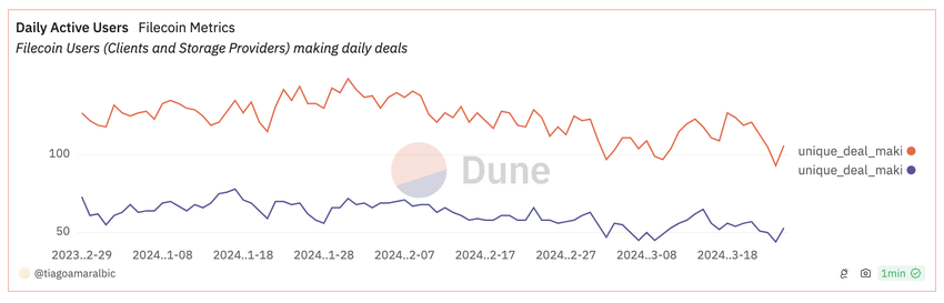 ユーザーエンゲージメントのこの漸進的な減少は、この減少傾向を相殺する顕著な回復期間の存在なしに継続的な減少を強調しているため、特に憂慮すべきものです。毎日の劇的な下落がないという事実は、すぐに心配するようなことではないかもしれませんが、時間の経過とともにアクティブユーザーが着実に減少していることは、懸念すべき傾向を示しています:Filecoin はゆっくりと、しかし確実にその勢いを失いつつある。