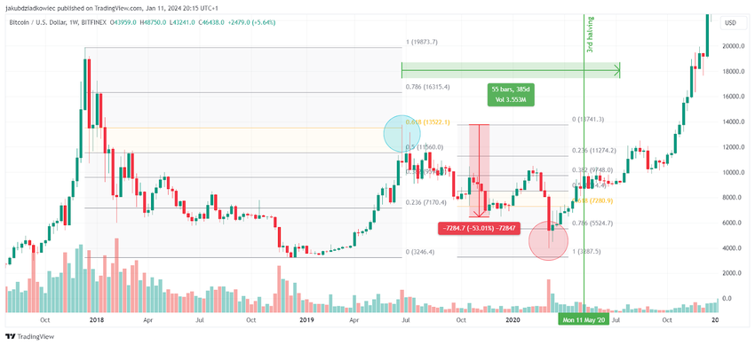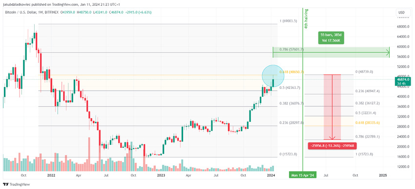 ビットコインの長期チャートにおける現在のテクニカル状況は、2019年のそれと非常によく似ている。継続的な上昇により、BTC価格もゴールドポケットエリアと48,750ドル(青丸)のローカルピークに到達したところだ。興味深いことに、このマクロレベルへの到達は、スポットビットコインETFの承認と一致している。