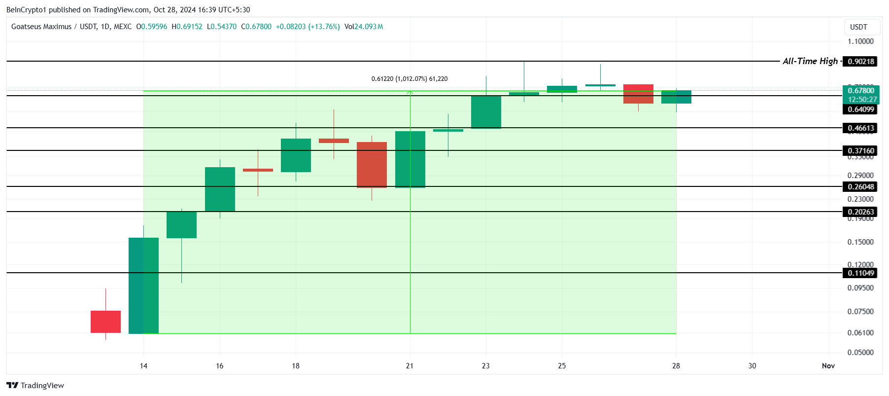 GOATの価格は、わずか1ヶ月で1012%の驚異的な急騰を記録し、新たな最高値0.902ドルを達成しました。この急上昇はミームコインに注目を集め、アルトコインセクターで際立っています。