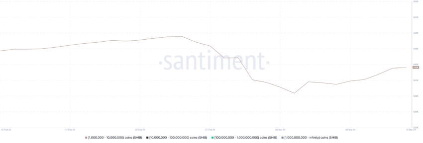 この後、3月4日から3月12日にかけて、このレンジ内の保有者数は539,000人から543,000人へとわずかに回復した。このパターンは、SHIB の一部のクジラが利益を得た後、その資産を買い戻したことを示唆している。