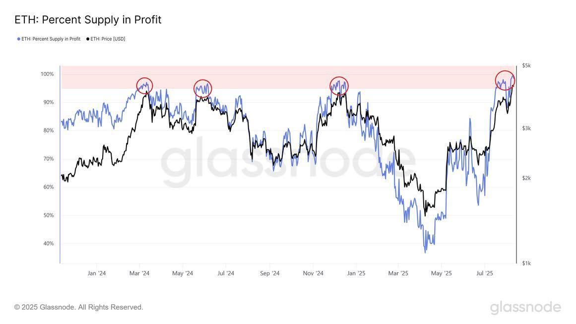 流通中のイーサリアム(ETH)の98%超が現在利益を計上しており、2年ぶりの高水準となっている。投資家による利益確定売りが出る可能性があり、価格調整リスクが高まっている。