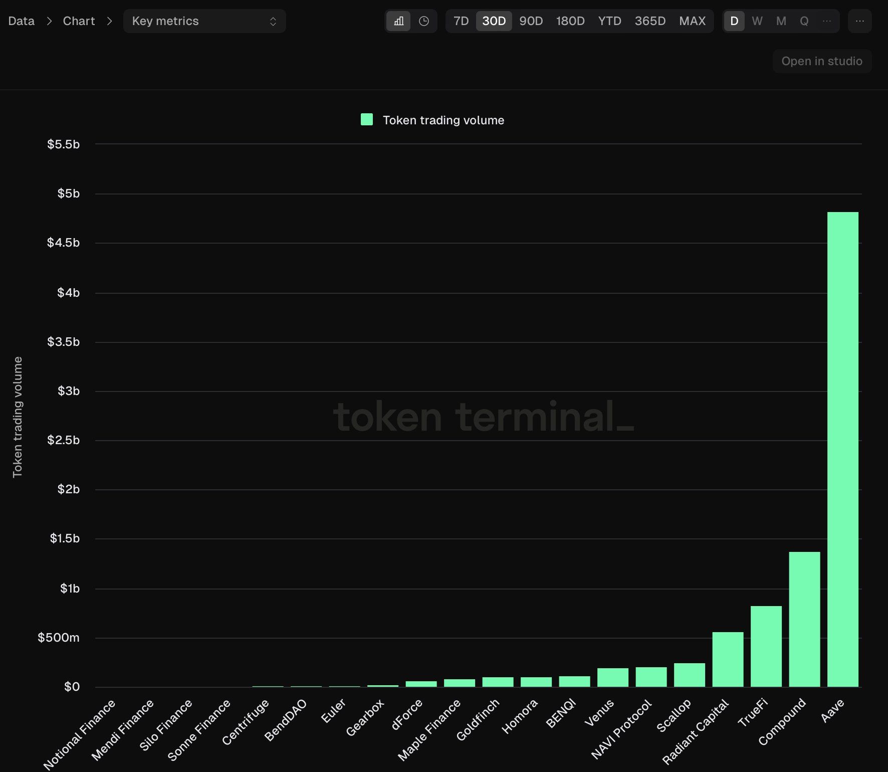 さらに、Token Terminalのデータによると、Aaveは過去30日間、トレーダーや投資家の間で最も関心を集めている。これは、暗号貸出市場セクターのガバナンス・トークンの月間取引量を見ても明らかだ。Token Terminalのチャートによると、AAVEの月間取引量は報告期間中にほぼ50億ドルの大台に達した。