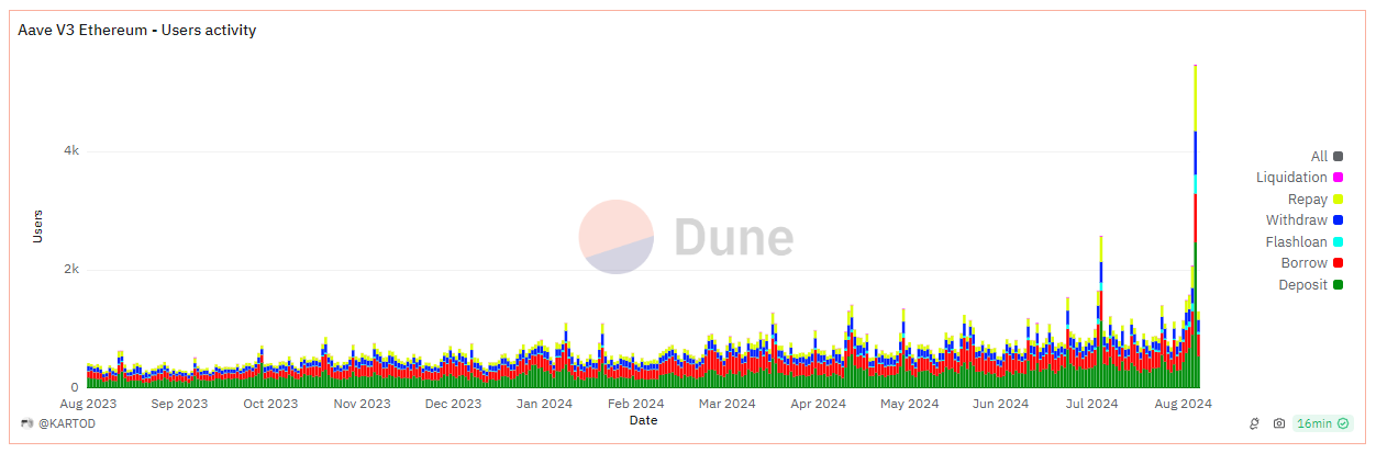 Duneのダッシュボードからのデータは、8月5日に17の清算イベントを示し、活動を確認した。さらに、2,127件の入金、985件の返済、614件の引き出しがあった。これらの数字は、昨年8月以来、Aave V3イーサリアムにおける最高のユーザー活動を示している。