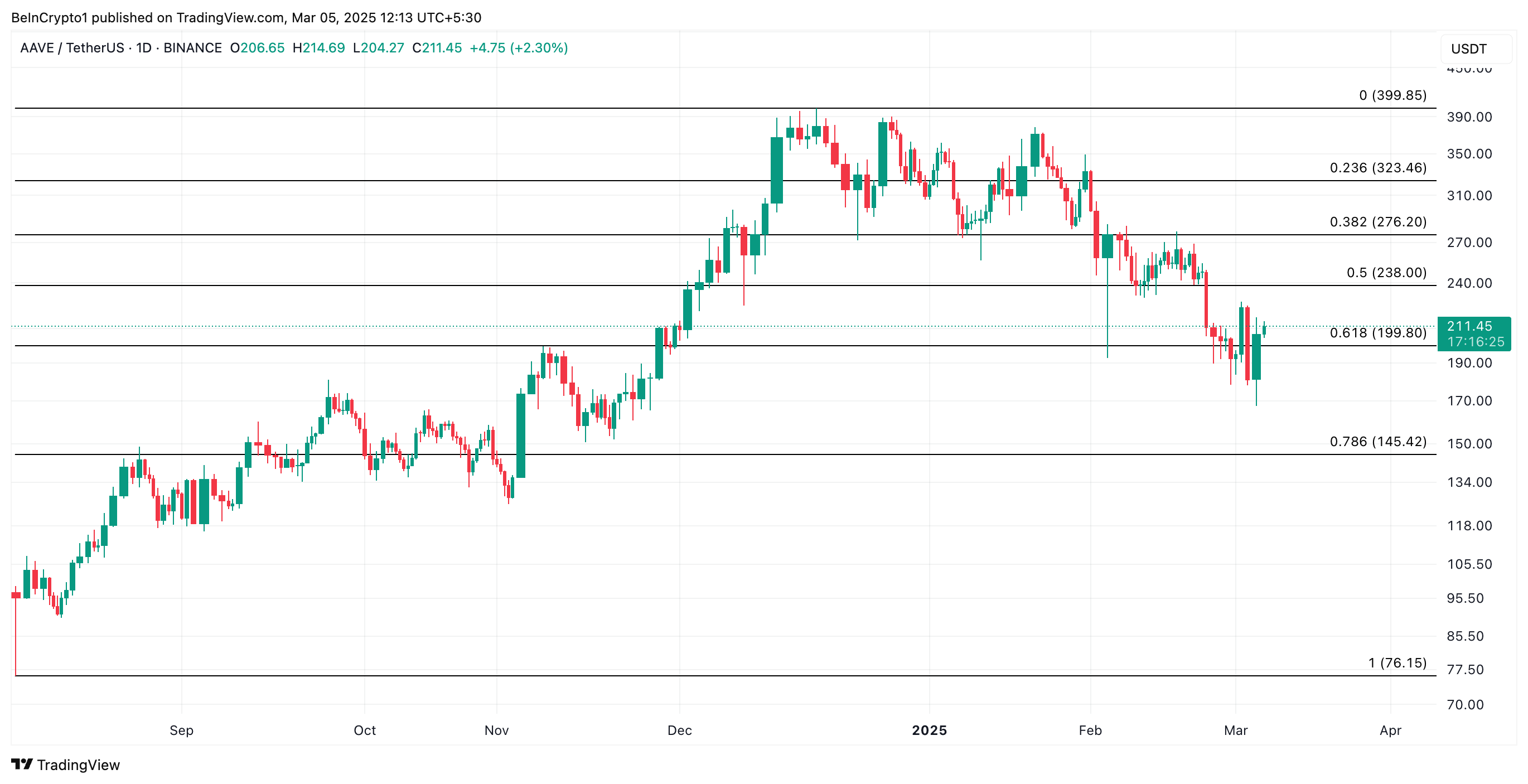 AAVEは本稿執筆時点で211.45ドルで取引されており、199.80ドルで形成されたサポートをわずかに上回っている。売却が続く場合、強気派はこのサポートレベルを守るのに苦労するかもしれない。