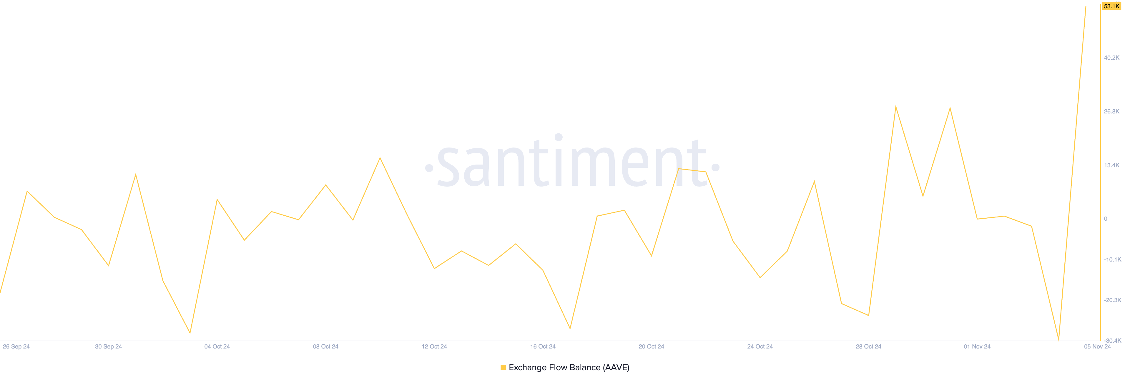 これらのAAVEクジラの行動は取引所の流入バランスを急激に増加させた。Santimentのデータによると、現時点でこのバランスは53000 AAVEで、9月10日以来の1日の最高流入量である。