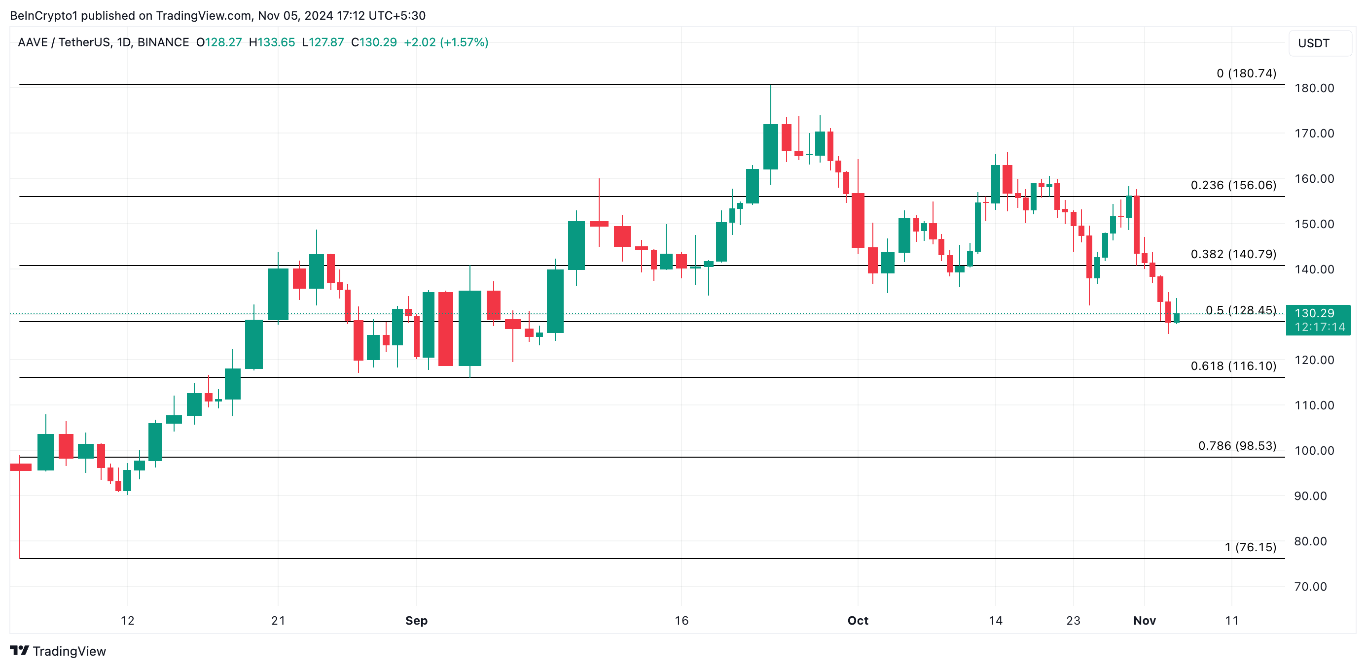 逆に、市場のセンチメントが強気に転じる場合、AAVEの価格は反転する可能性があり、次の抵抗レベル140.79ドルに向かってラリーするかもしれない。