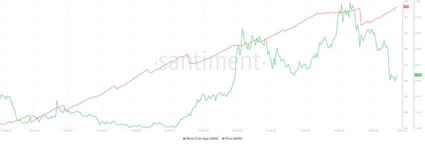 過去2週間におけるADAホルダーの確信は、第1四半期を通してよりも著しく強いため、同じ兆候は目に見えている。暗号通貨の全流通コインの平均年齢を示す平均コイン年齢は、上昇に注目している。