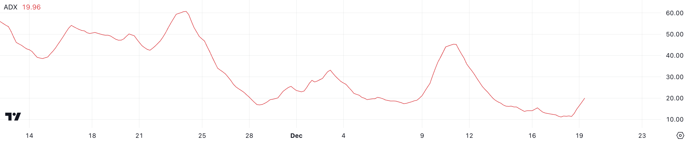 ADX(平均方向性指数)はトレンドの強さを測定するが、その方向を示さない。25以上の値は強いトレンドを示し、20未満の値は弱いまたはトレンドのない市場を示す。