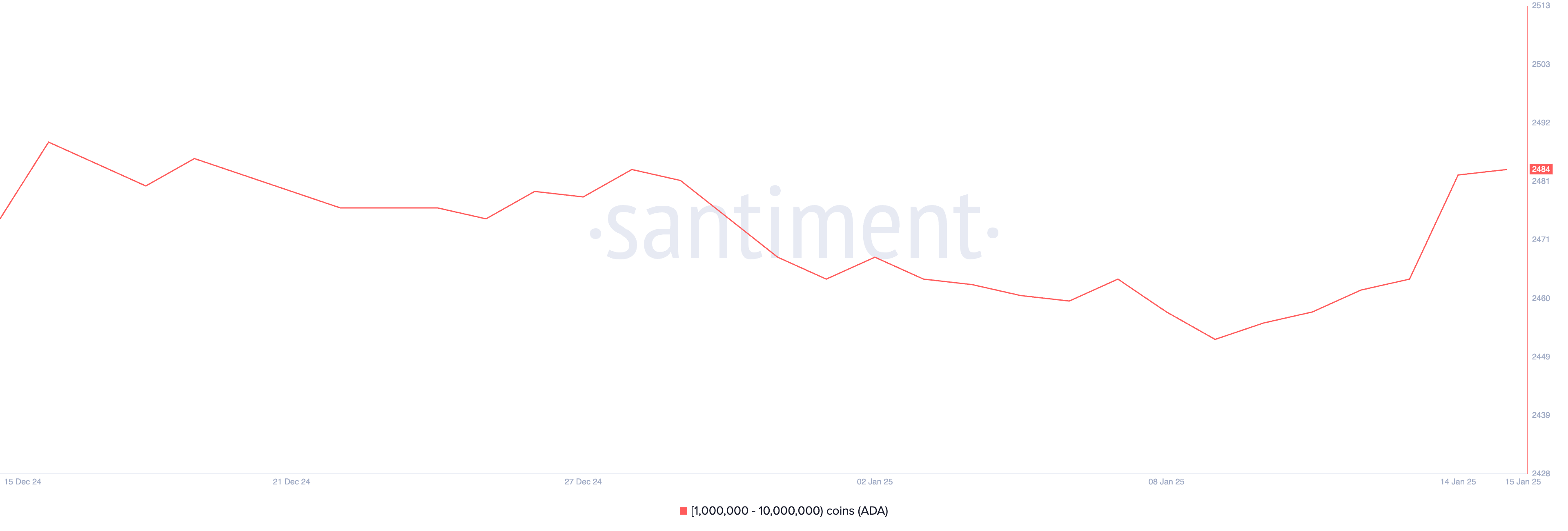 カルダノのクジラの数、つまり100万から1000万ADAを保有するウォレットの数は、1月9日に月間最低の2453に達しました。それ以来、数は着実に増加し、現在は2484に達し、12月28日以来の最高レベルです。