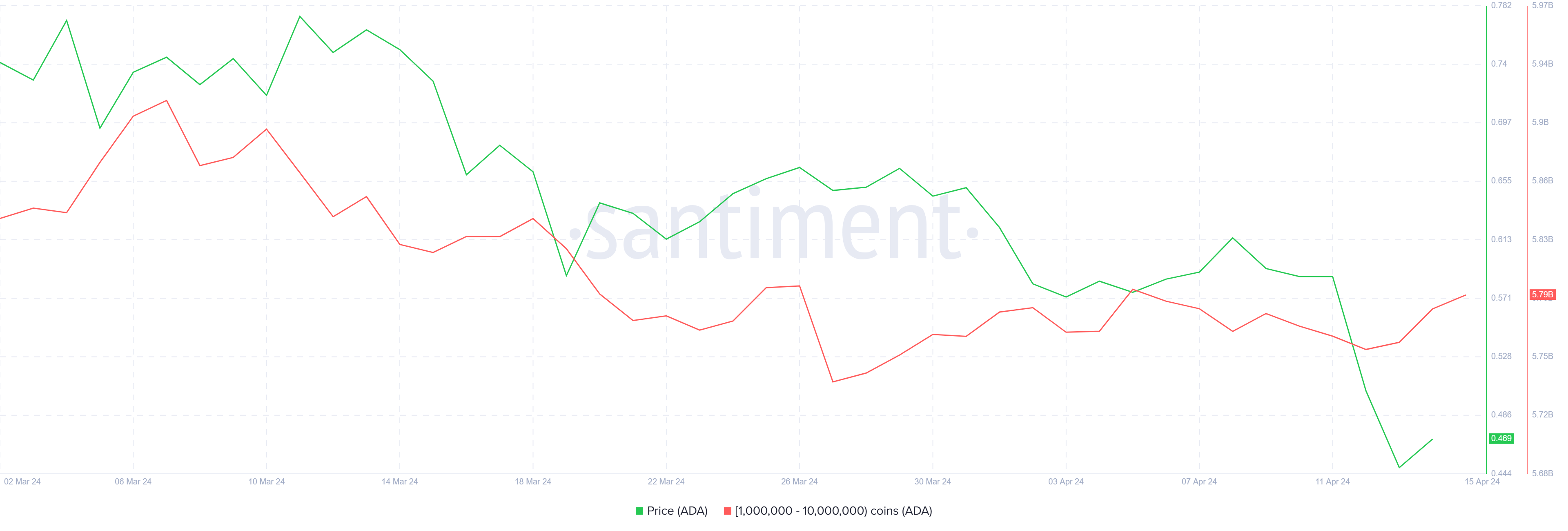 カルダノの価格は歴史的にADAホルダーの行動に反応しており、これが回復の鍵となる可能性がある。ネットワーク上で取引を行っているクジラ投資家は保有量を増やしている。