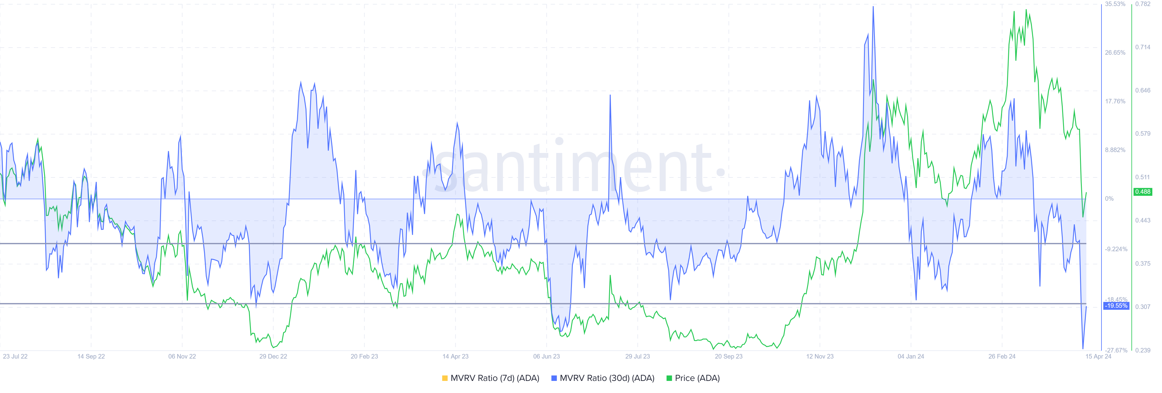 SponsoredMVRV比率は投資家の利益/損失を測定します。カルダノの現在の30日MVRVは-19%で、最近の買い手の損失を示唆しており、おそらく蓄積につながる。歴史的に、ADAの回復は-13%から-21%の間で起こっており、蓄積のチャンスゾーンであることがわかります。