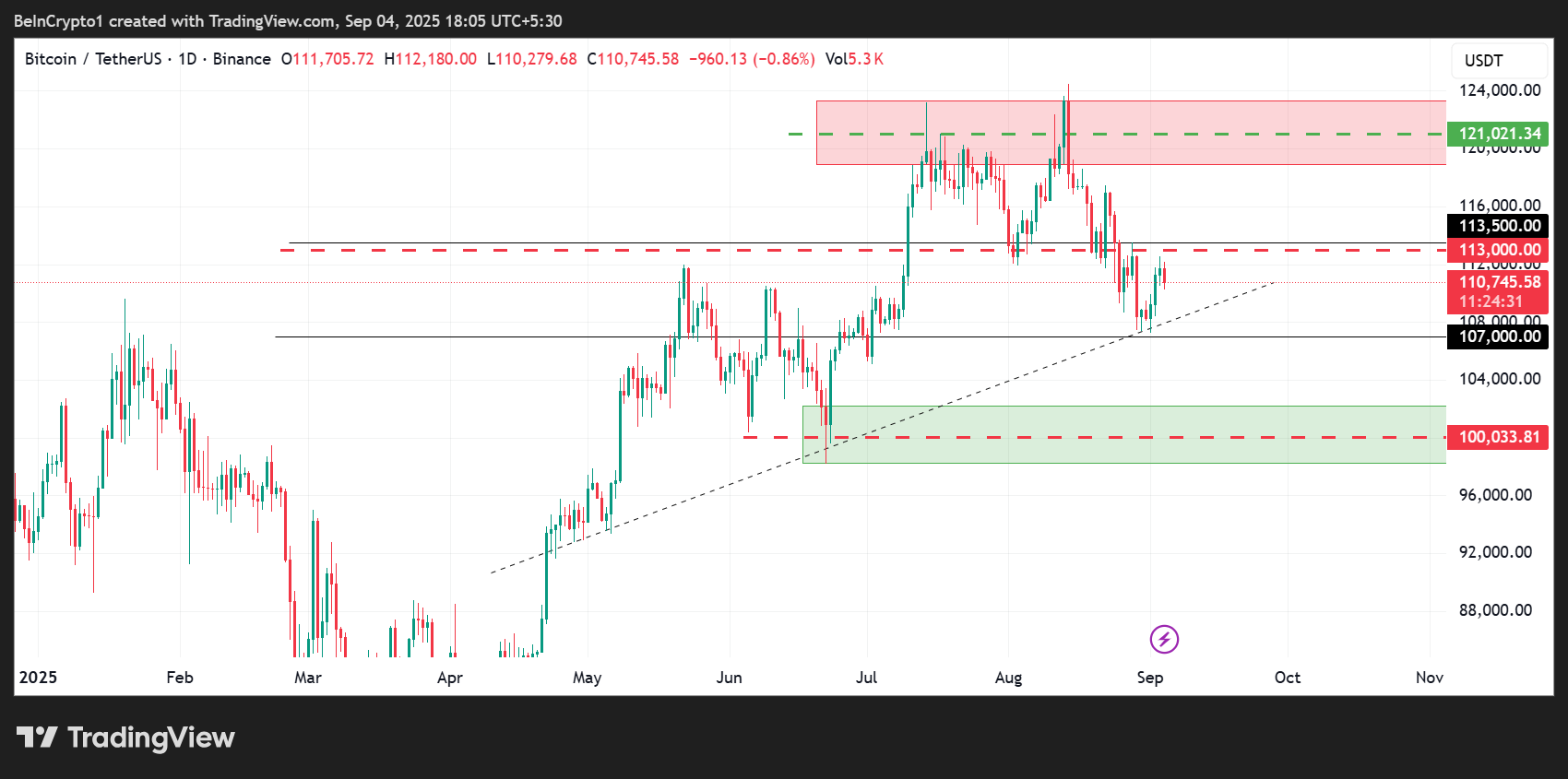 BTCは本稿執筆時点で11万1000ドル付近にあり、これらの重要なレベルの間に挟まれている。