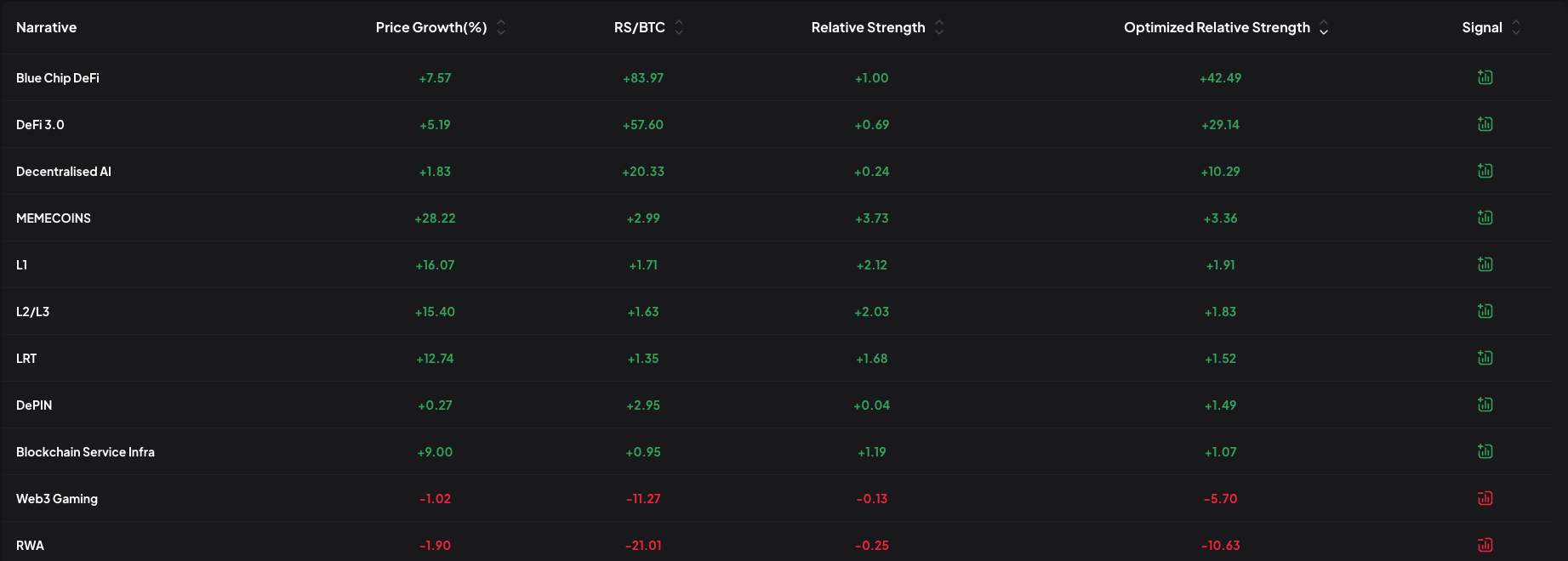 このような個々のトークンのパフォーマンスに加えて、暗号資産セクターにおける全体的なAIのシナリオも引き続き堅調である。暗号資産分析プラットフォームDYORによると、この物語の強さは現在、ビットコインに対して3番目に高く、主要な分散型金融(DeFi)セクターだけが上回っている。