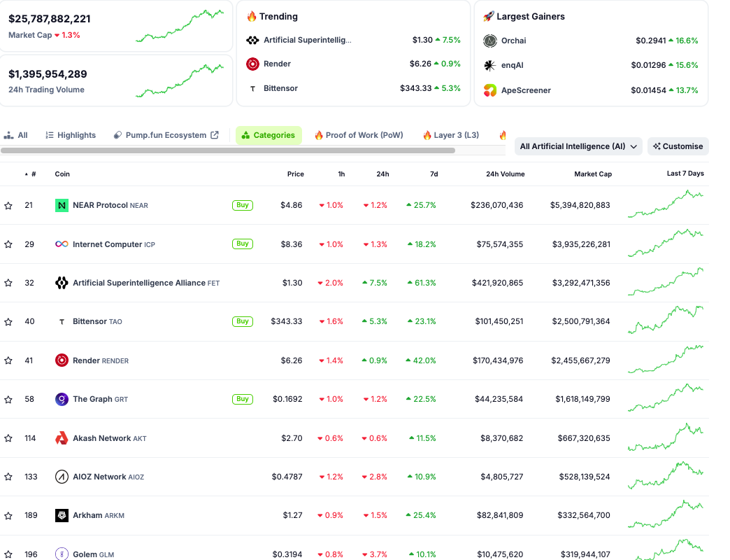人工超知能アライアンス(FET)は61.3%の上昇でAIアルトコインの急騰を牽引した。Render (RENDER)が42%上昇で僅差で続き、NEAR Protocol (NEAR)とBittensor (TAO)はそれぞれ25.7%と23.1%上昇した。