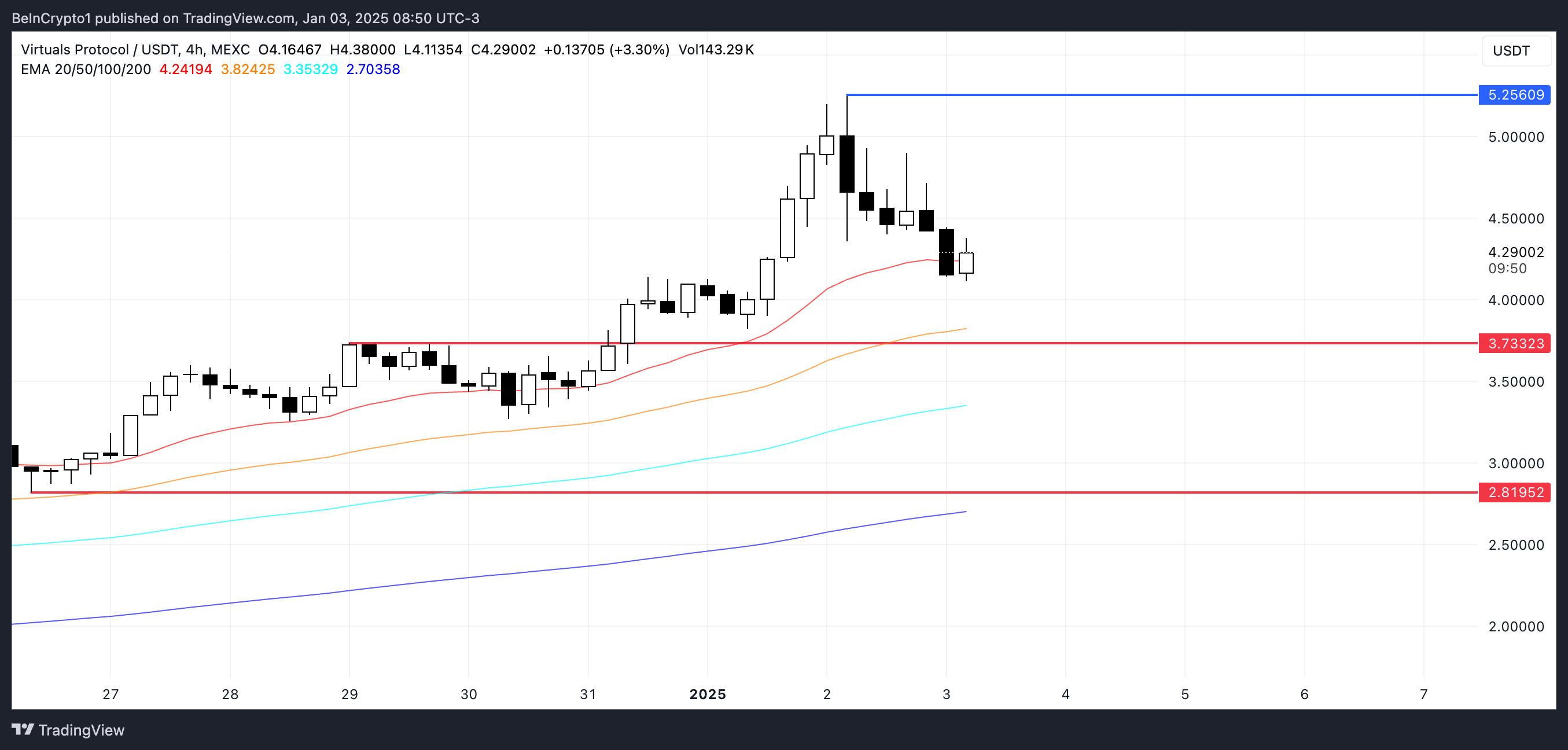時価総額42億ドルのVIRTUALは、RENDERやTAOなどの競合を超えて、現在の人工知能コインのリーダーです。上昇トレンドが再開すれば、VIRTUALは再び5ドルの抵抗をテストし、5.25ドルまで上昇する可能性があります。しかし、修正が入ると3.73ドルまで下落し、サポートレベルが失敗すると2.81ドルまで下がる可能性があります。