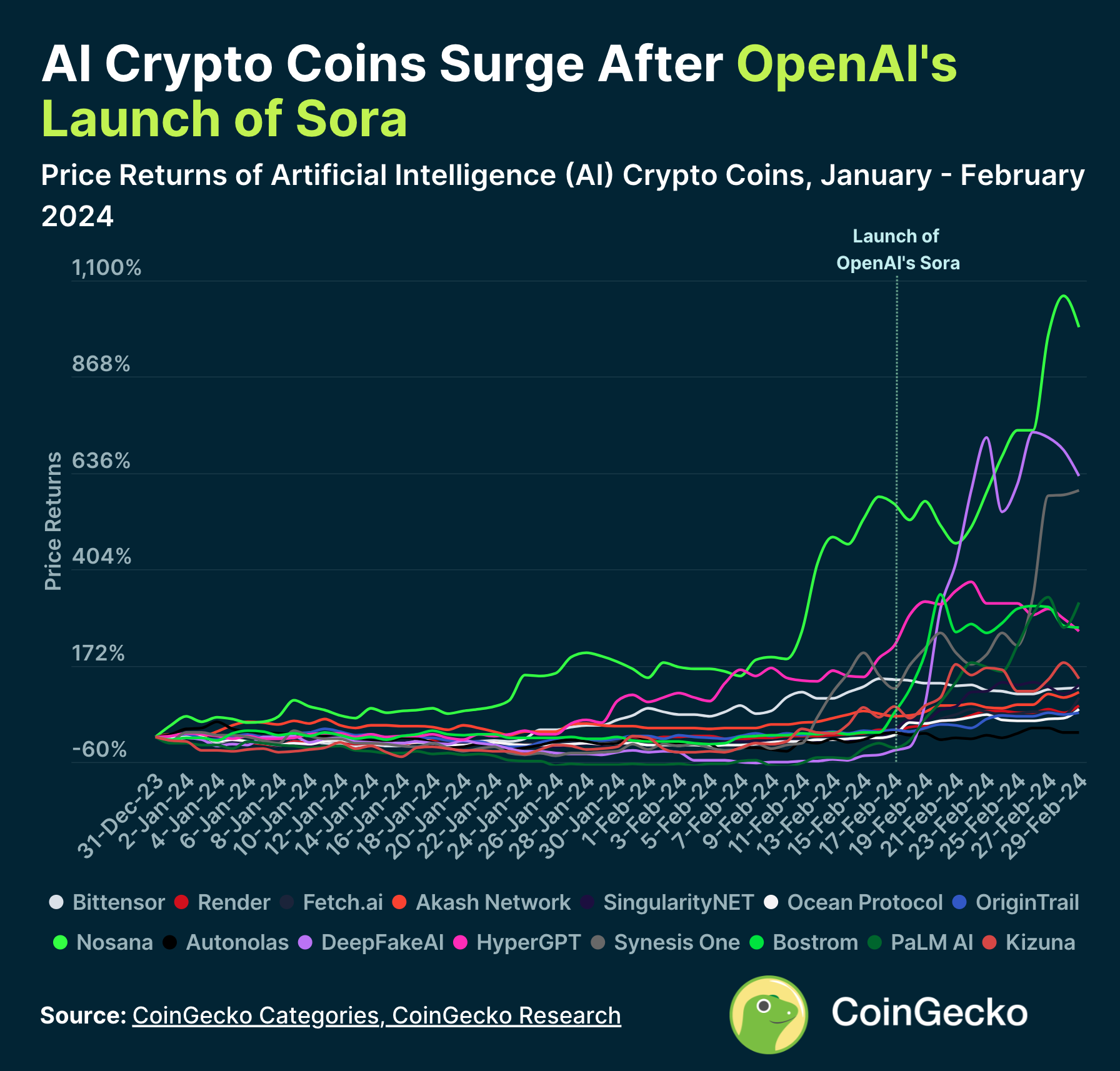 BittensorはTAOトークンを利用した分散型機械学習プロトコルで、1月から2月にかけて最大のAI暗号通貨としての地位を確立。価格上昇率ではNosanaが最も大きく、987.9%の上昇を記録し、価格は0.56ドルから6.01ドルに急騰した。続いてDeepFakeAIが628.6%、Synesis Oneが595.4%の価格上昇を見せた。