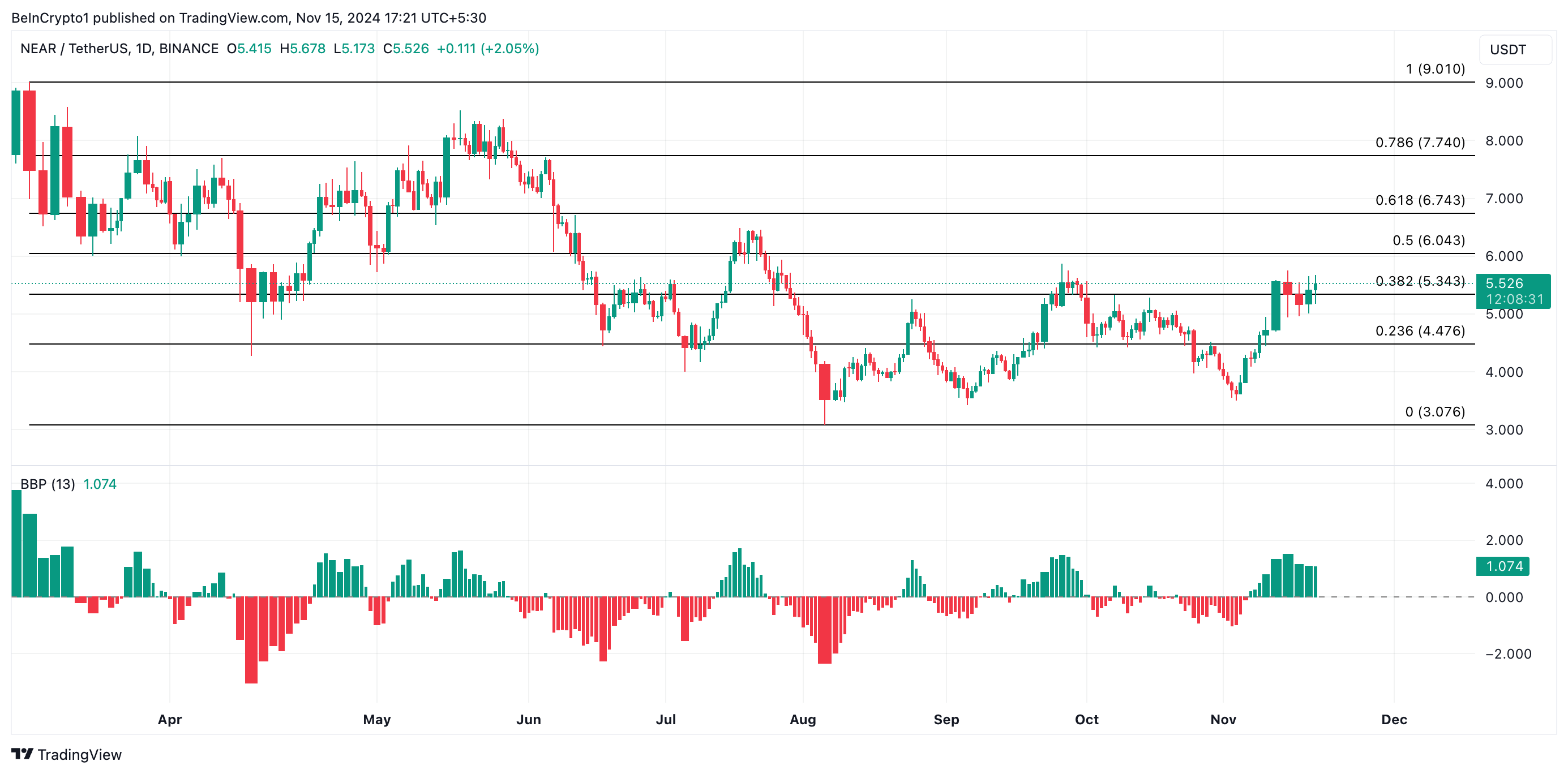 NEARもまた過去一週間で印象的なパフォーマンスを示したAIトークンである。5.52ドルで取引され、レビュー期間中に31%のラリーを記録した。