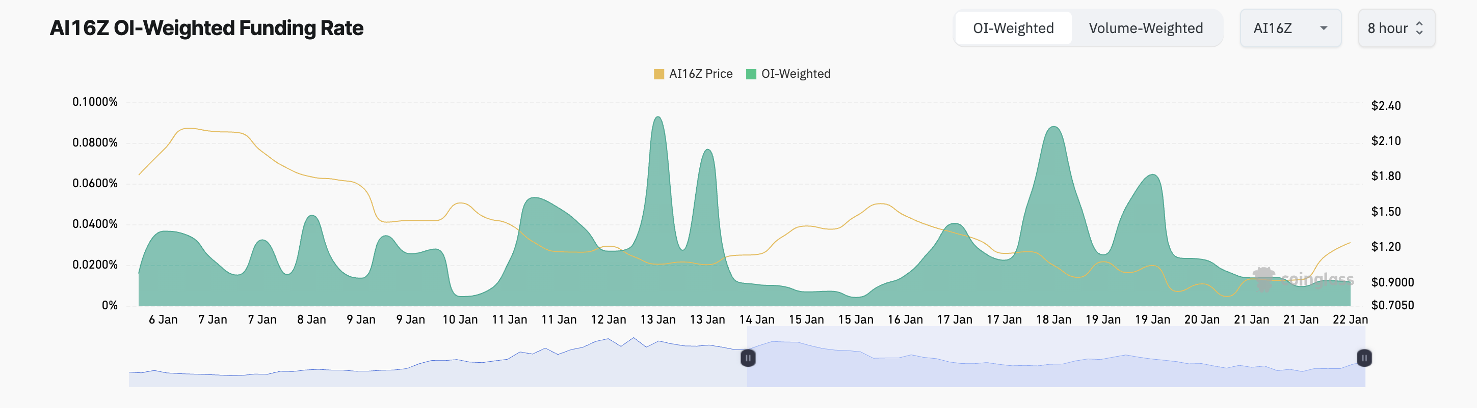 SponsoredAI16Zの資金調達率はプラスのままで、強い上昇傾向を反映しています。本稿執筆時点で、0.011%であり、先物市場でのロングポジションの需要を示しています。