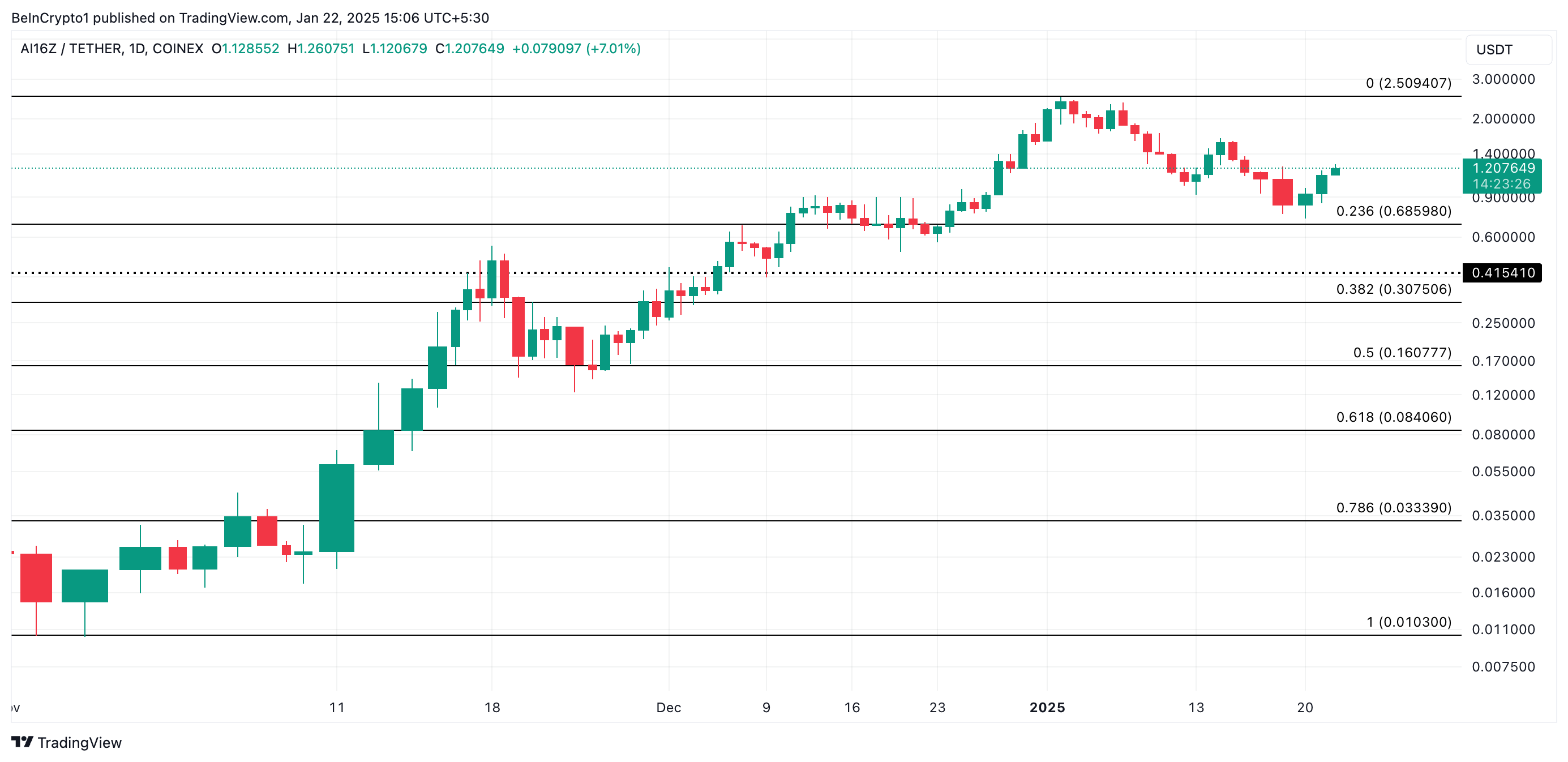 AI16Zは、上昇傾向が続く場合、ラリーを続ける可能性があります。その場合、1月2日に達成した過去最高値の2.50ドルを再テストするかもしれません。