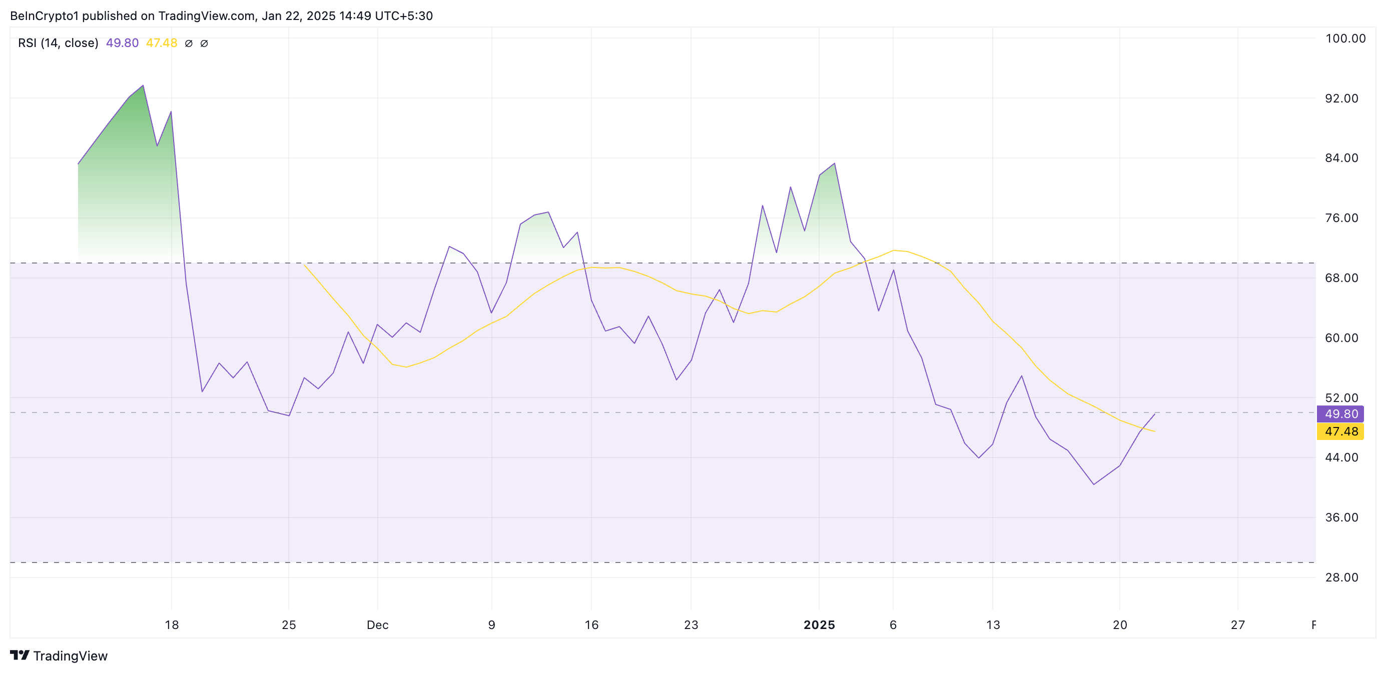 資産のRSIは、買われ過ぎと売られ過ぎの市場状況を追跡します。50を超えると、資産の価格動向が弱気から強気に転じる可能性を示します。これは買い圧力が増加しており、資産が上昇トレンドに入る可能性があることを示唆しています。