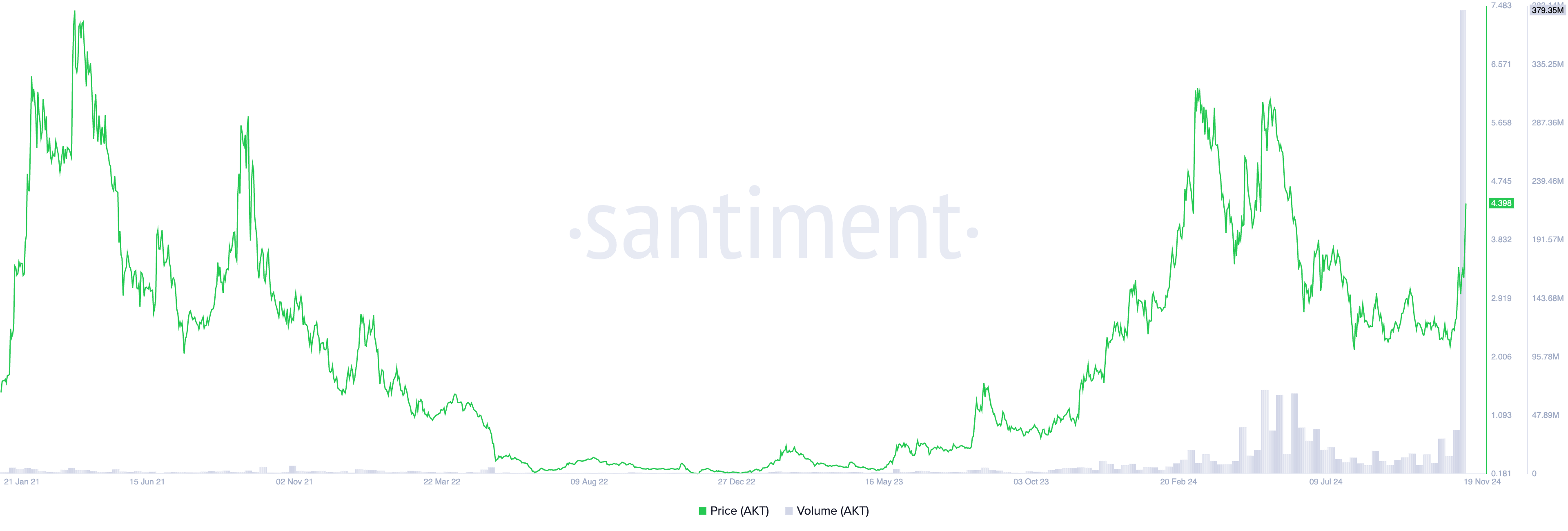 Akash Networkを動力源とするネイティブトークンAKTは、過去24時間で約30%急上昇した。同時期に、取引量は2,590%増加し、3億8000万ドルを超えた。