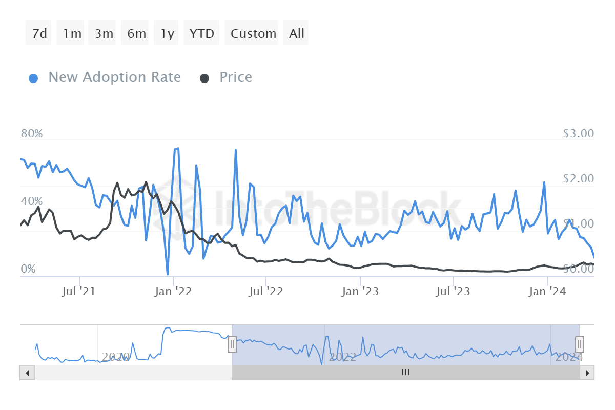 この傾向は、新規採用率という指標によって浮き彫りになっている。この指標は、新規に作成されたアドレスによる取引を評価し、プロジェクトが投資家の間で人気を集めているのか、それとも人気を失っているのかを測るものである。Algorandの場合、この指標は2カ月ぶりの低水準を記録しており、市場の牽引力が低下している可能性を示している。