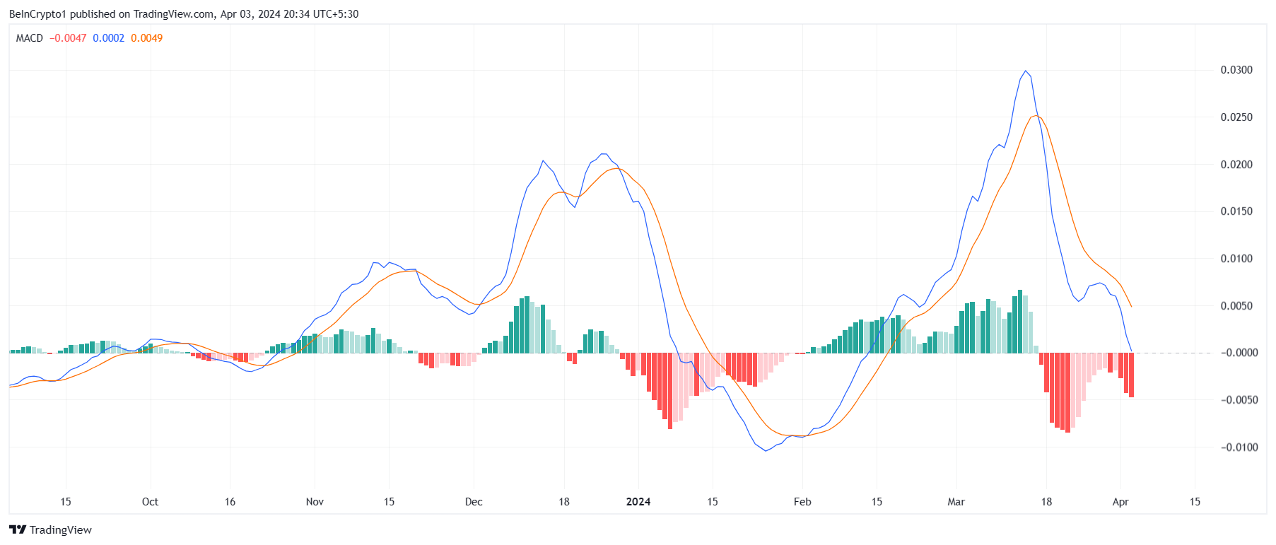 現在、MACDはヒストグラムで赤色の延びたバーを示し、弱気トレンドの継続を示唆している。これは、Algorandの価格が引き続き下落圧力に直面する可能性を示唆している。