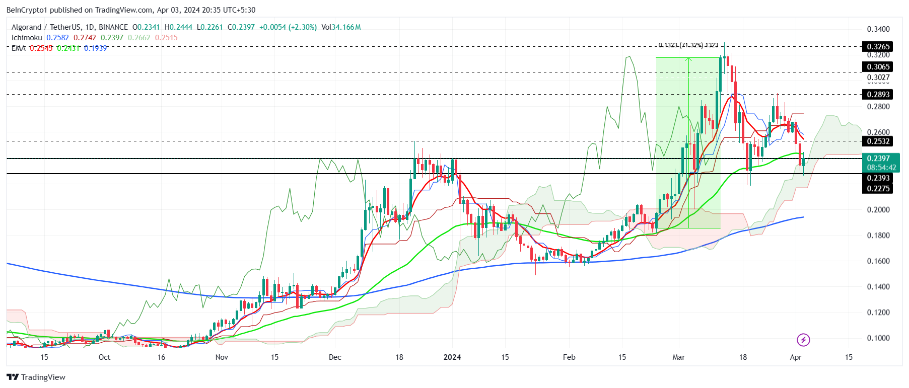 現在の課題がAlgorandの価格に大きな影響を与える場合、0.23ドルまで下落する可能性がある。このサポートレベルを突破すると、さらに0.20ドルまで下落する可能性があり、投資家はかなりの損失を被ることになる。