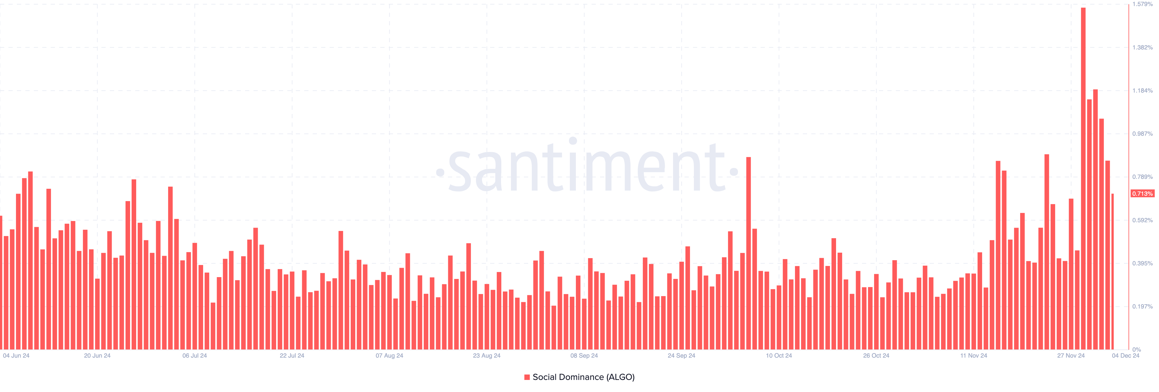 しかし、Santimentによると、アルゴランドのソーシャルドミナンスは11月30日の1.56%から今日の0.71%に低下している。現在の状況を考えると、ALGOの価値はさらに下落する可能性がある。