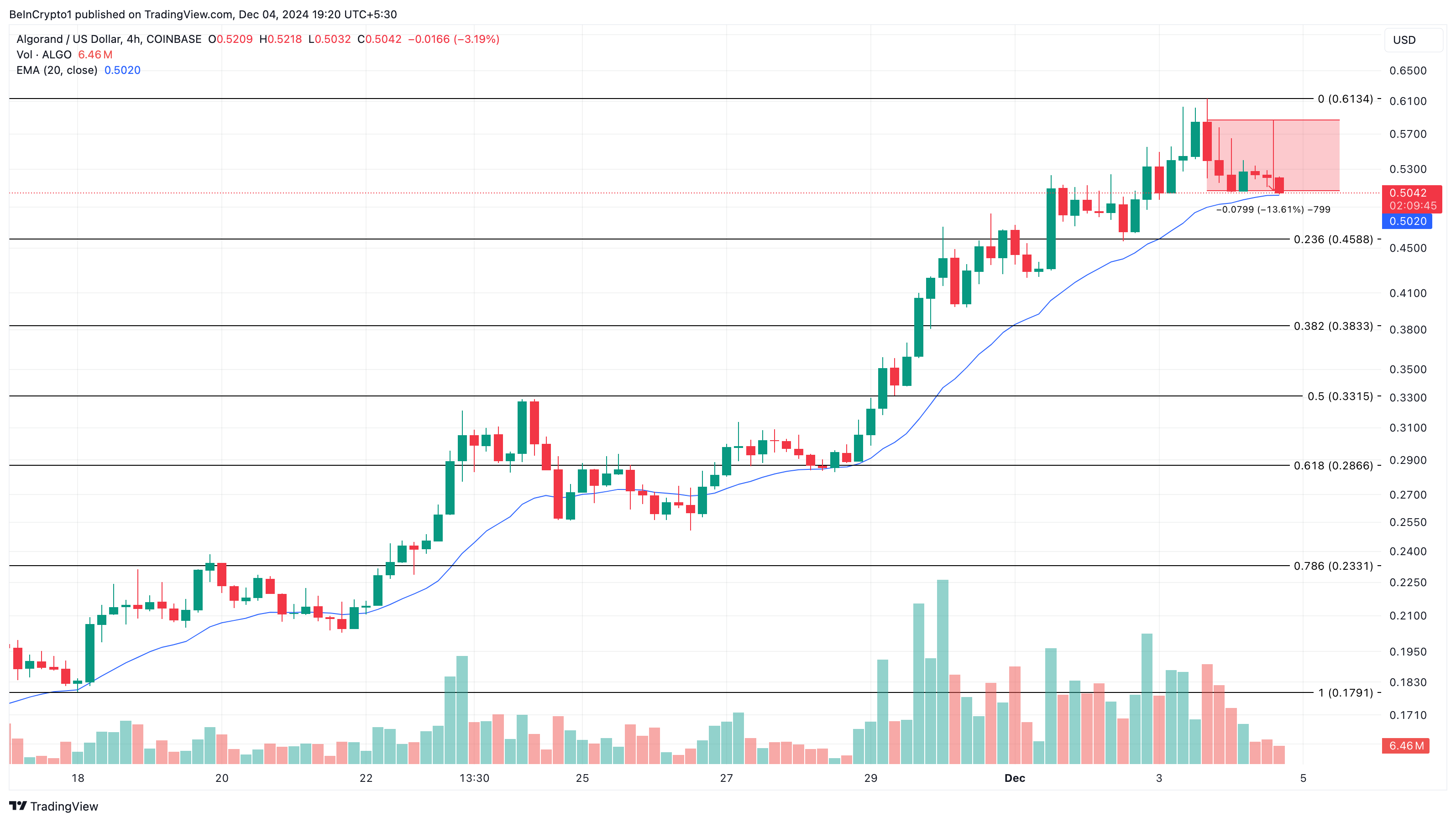 この記事執筆時点で、ALGOの価格は0.51ドルである。4時間チャートでは、同アルトコインが20期間の指数移動平均(EMA)を下回る寸前にある。