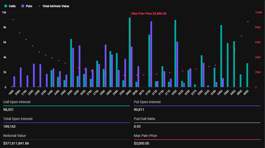 Deribitのデータによると、ビットコインのオプション満了は3万8,566契約に関わっており、先週は4万8,794契約だった。同様に、イーサリアムの満了オプションは18万9,018契約で、前週は29万4,380契約だった。