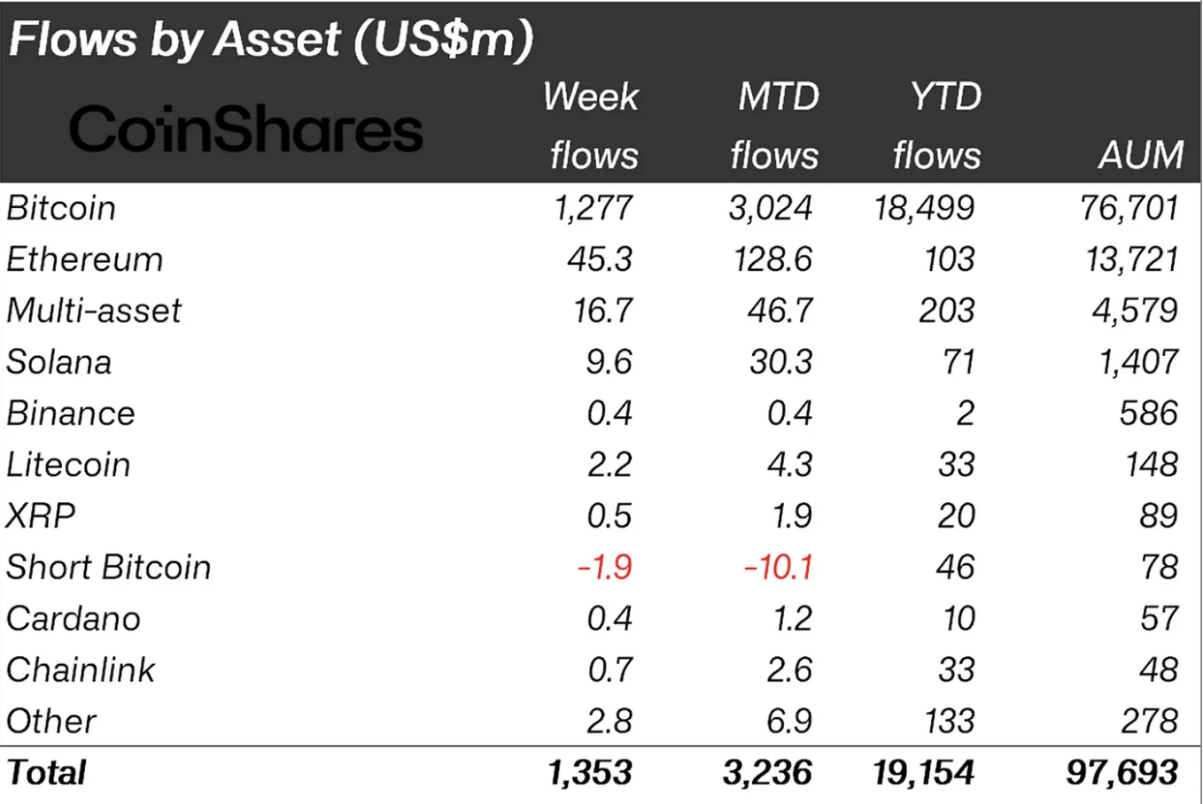CoinSharesによると、イーサリアム(ETH)、ソラナ(SOL)、バイナンスコイン(BNB)などの暗号通貨がプラスのネットフローを記録した。