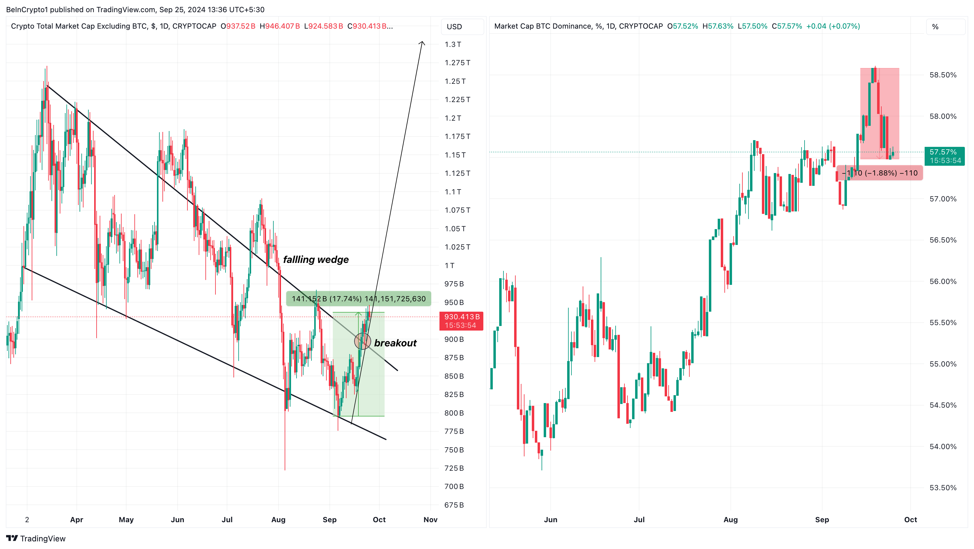 このブレイクアウトが成功すれば、アルトコインのシーズンが加速し、真に実現する可能性があります。ただし、ビットコインの優位性を監視することは依然として重要です。BTCの場合。Dのリバウンドとアルトコインの時価総額が拒否され、1兆5000億ドルへの予測された上昇は短期間で実現しない可能性があります