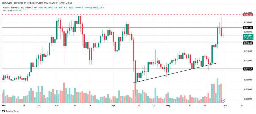 その見返りとして、ネットワークとアセットの利用が増加し、CHZに利益をもたらす可能性がある。その結果、アルトコインは0.154ドルを超え、0.167ドルの壁を破り、2024年の新高値を形成する可能性がある。