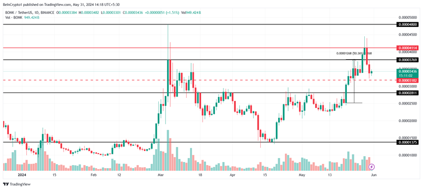 アルトコインの終値は最近0.00004114ドルとなり、史上最高値を記録したが、ATH価格の0.00004800ドルにはほど遠い。したがって、BONKホルダーの助けを借りて、ミームコインは上昇を続け、年初来高値を更新する可能性がある。